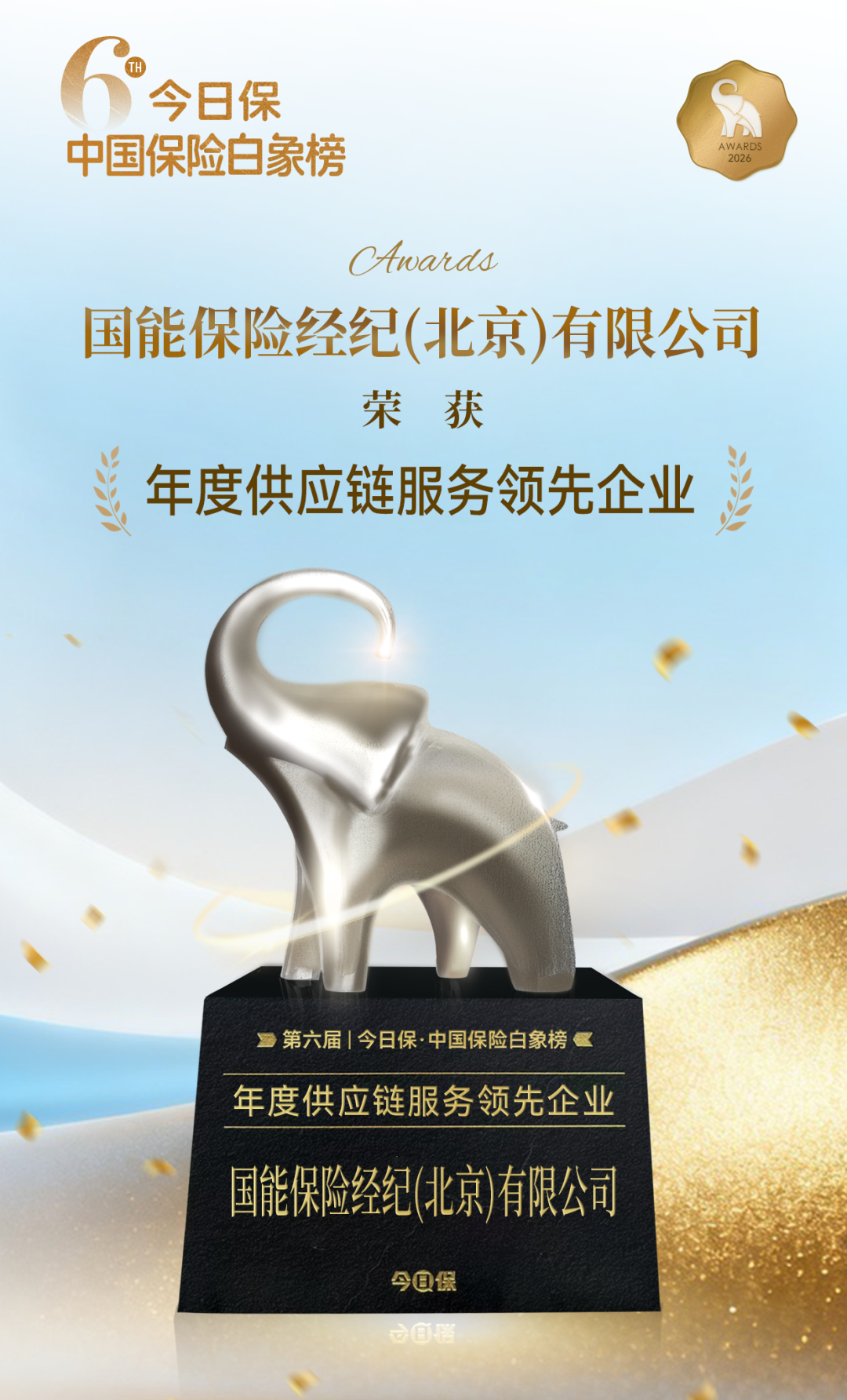 捷报飞扬,振奋人心!12月18日,第六届“今日保·中国保险白象榜”正式发布,国能保险经纪公司荣获“年度供应链服务领先企业”称号!